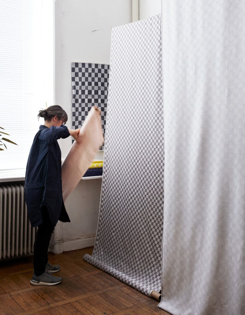 Foto: ArkDes När mönstret Gåsöga var färdigvävt och mätte 25 m, klipptes det ner och skickades till Stockholm för att installeras på ArkDes. Den delas där till två vävar som går att se i entréhallen och är en stor del av utställningen kring Power of Places. Utställningen går att se mellan 2024-09-27 till 2025-08-25.