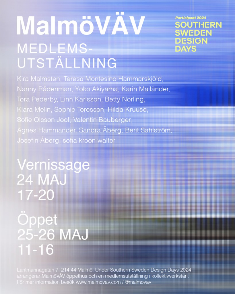 23–26 maj hålls fjärde upplagan av Southern Sweden Design Days – en internationell designfestival i Malmö som synliggör och bygger kunskap kring design med fokus på hållbarhet, utveckling och innovation. Som en del av festivalen öppnar MalmöVÄV upp verkstan för medlemsutställning! Utställningen representerar ett brett spektrum av vävda tekniker och uttryck från 18 av våra tidigare bekanta likväl nya medlemmar.