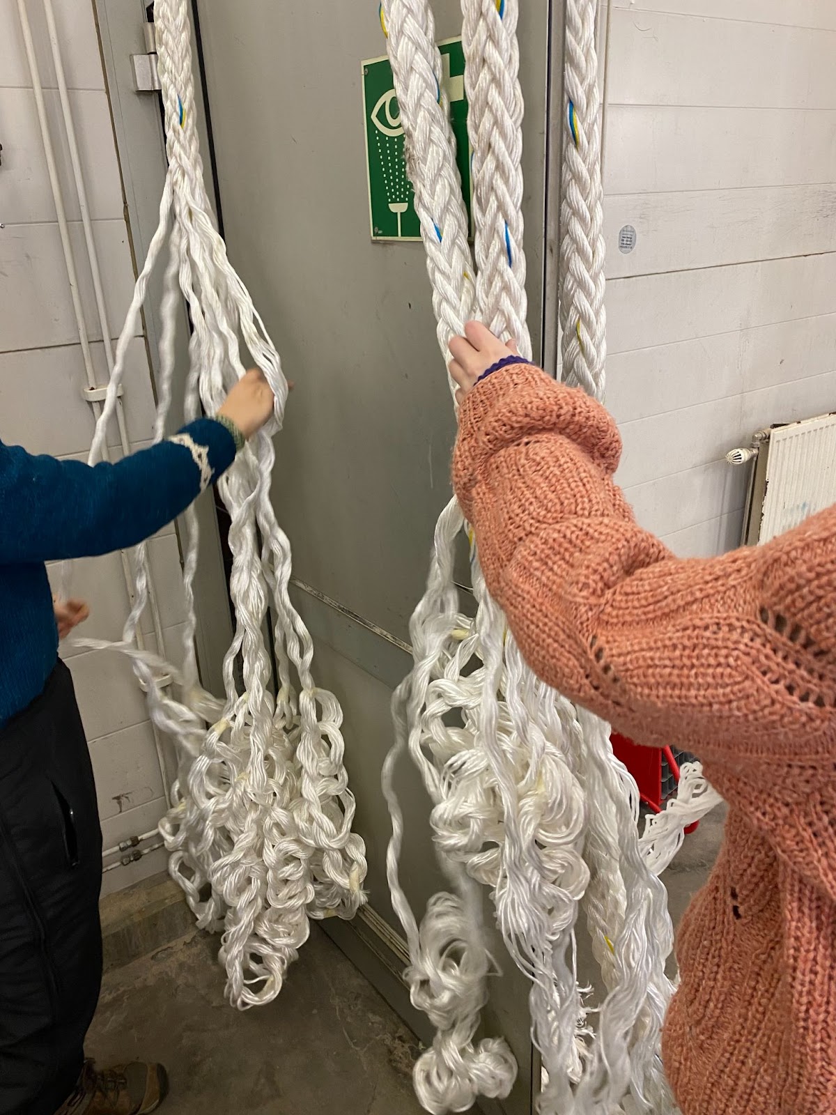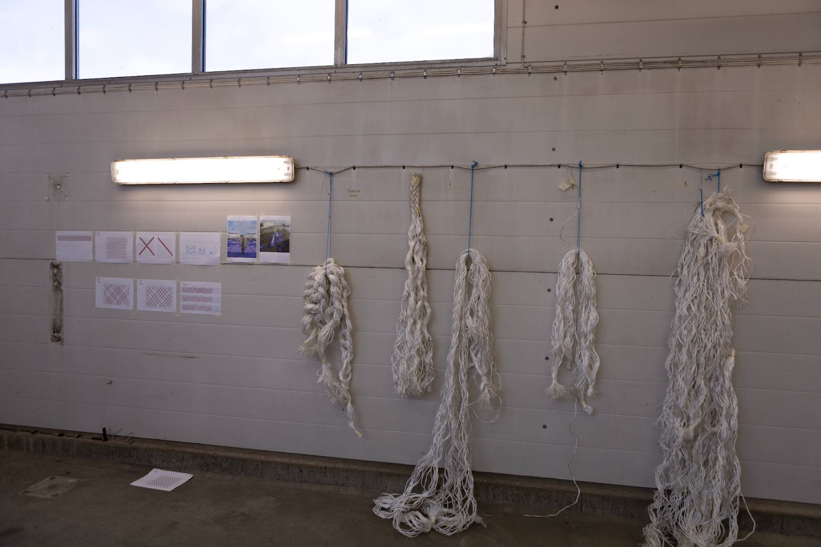 Repdelar kapade och sorterade i olika längder med arbetsbeskrivning på väggen i garaget. Foto: ArkDes Mycket tid har lagts på förarbetet i ett garage i Nyhamnen, där allt material och utrustning förvarades. Repen flätas upp och grupperas i olika längder för att passa de olika stora romberna i mönstret.