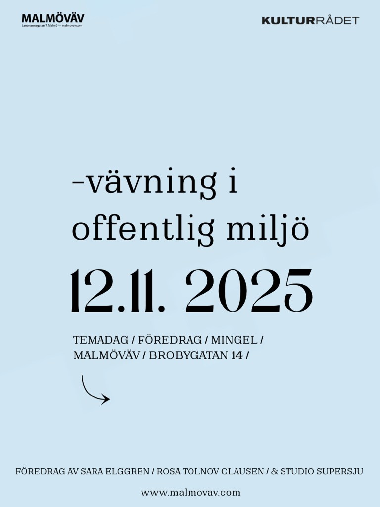 Den 12 november bjuder MalmöVÄV in till en temadag om vävning i offentlig miljö med föredrag av Sara Elggren, Rosa Tolnov Clausen och Vega Määttä Siltberg från Studio Supersju som alla har erfarenheter av att arbeta konstnärligt med vävning i offentlig miljö på olika sätt. Temadagen är en del av MalmöVÄVs publika program och genomförs med stöd av Kulturrådet.